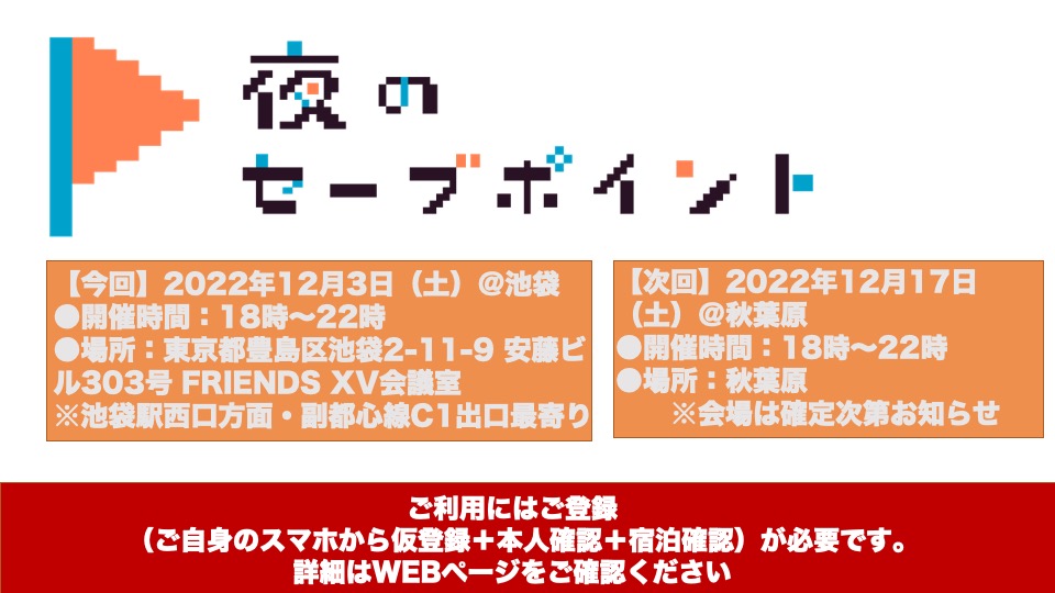 「夜のセーブポイント」ご利用にはご登録(①ご自身のスマホでのWEB仮登録②お名前がわかる書類の現地確認③ネカフェ等で暮らしていることがわかるレシート等の現地確認)が必要です。必ずこちらのトップページをご確認ください。