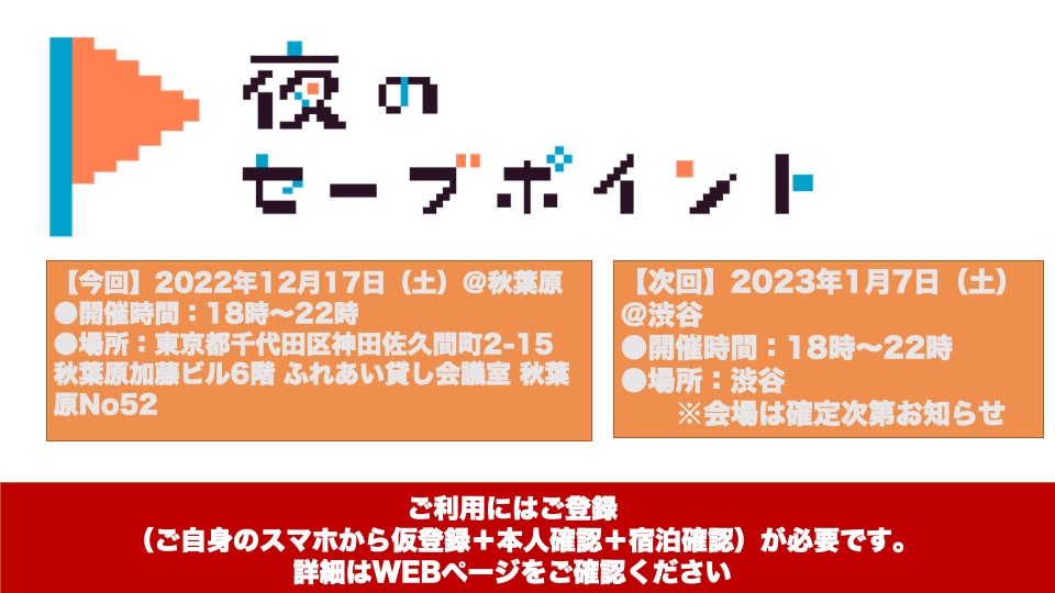 「夜のセーブポイント」ご利用にはご登録(①ご自身のスマホでのWEB仮登録②お名前がわかる書類の現地確認③ネカフェ等で暮らしていることがわかるレシート等の現地確認)が必要です。必ずこちらのトップページをご確認ください。