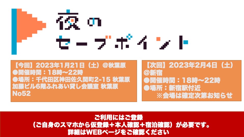 「夜のセーブポイント」ご利用にはご登録(①ご自身のスマホでのWEB仮登録②お名前がわかる書類の現地確認③ネカフェ等で暮らしていることがわかるレシート等の現地確認)が必要です。必ずこちらのトップページをご確認ください。