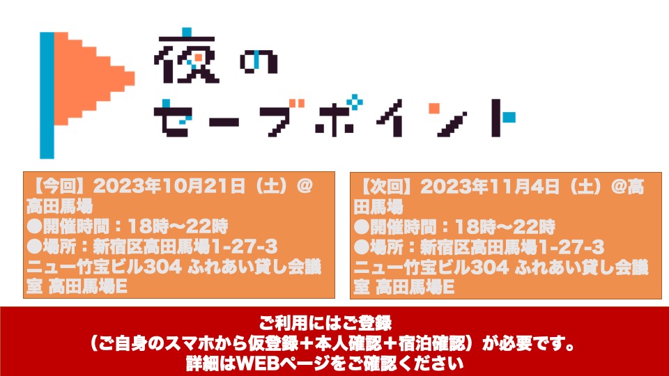「夜のセーブポイント」ご利用にはご登録(①ご自身のスマホでのWEB仮登録②お名前がわかる書類の現地確認③ネカフェ等で暮らしていることがわかるレシート等の現地確認)が必要です。必ずこちらのトップページをご確認ください。